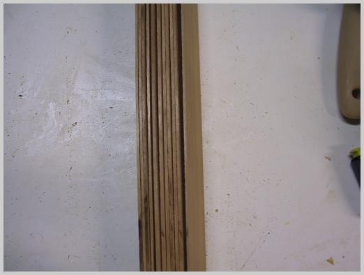 I spent the extra time to make some very strong laminated hand-holds on each side of the main-cabin at the base of the companionway stairs. These hand-holds are both very strong and look great. This page shows the steps I took to make these handles. I first cut thin strips the width and length I needed to make the hand-hold. For hardwoods like maple and birch, 1/8" or slightly less for thickness is about right. For the pictures shown, the strips are 1 5/8" wide and about 3/32" thick. The strips were cut on a bandsaw with a 3/4" wide blade, this gives the surface a rough feel but smooth enough for gluing without voids. The two strips that face outward are sanded to 240 grid, it will be hard to sand them later (unless you have a oscillating spindle sander). | ||||